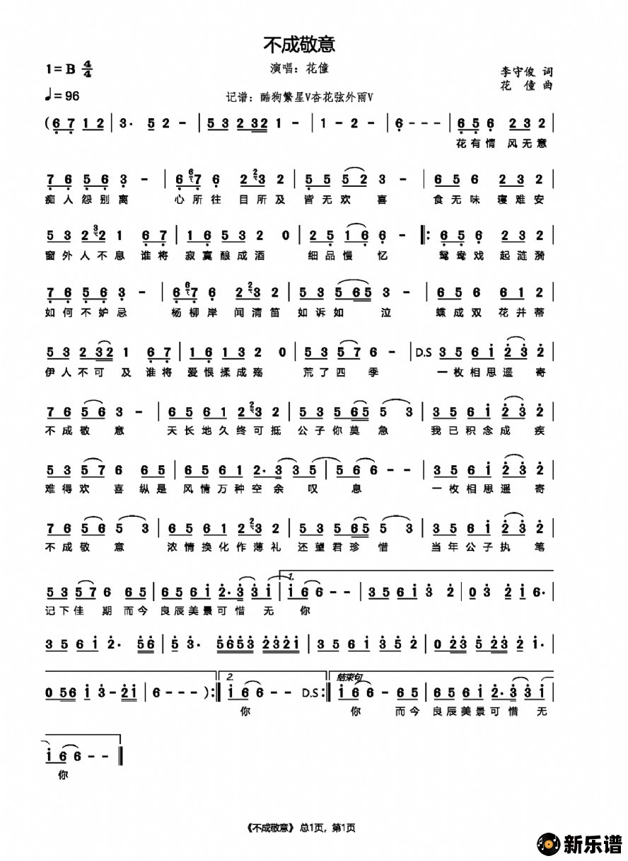 花僮演唱的不成敬意歌词,不成敬意简谱.