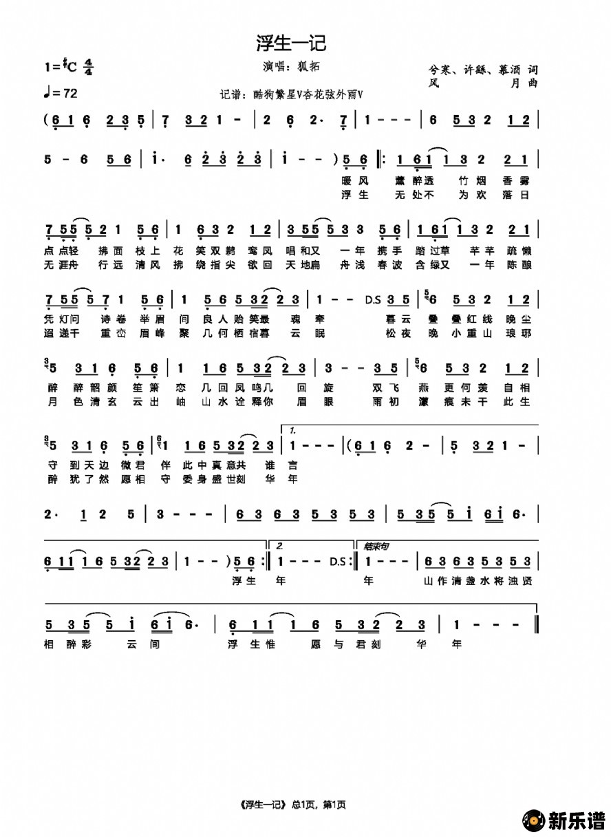 狐拓演唱的浮生一记歌词,浮生一记简谱.