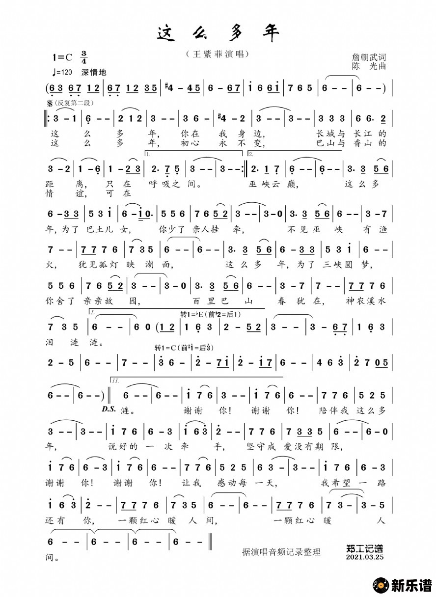 王紫菲演唱的这么多年歌词,这么多年简谱.