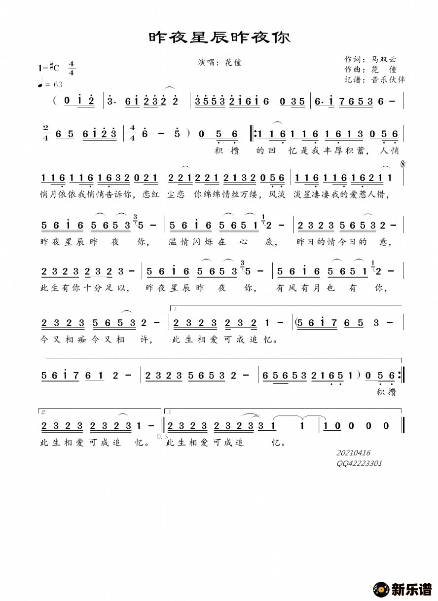 《昨夜星辰昨夜你》简谱 花僮-音乐伙伴制谱