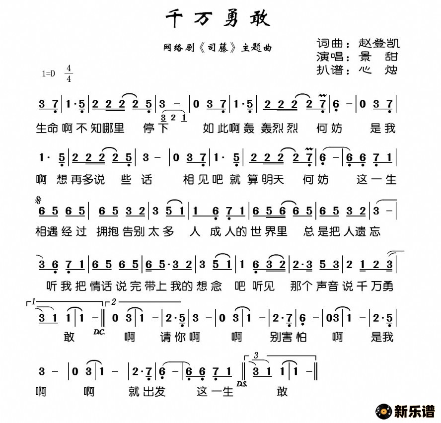 千万勇敢(《司藤》主题歌)景甜 景甜演唱的千万勇敢(《司藤》主题歌)歌词,千万勇敢(《司藤》主题歌)简谱. 生命啊 不知哪里停下如此啊 轰轰烈烈何妨是我啊 想再多说些话相见吧 就算明天何妨这一生相遇 经过 拥抱 告别 太多人成人的世界里总是把人遗忘听我把情话说完带上我的想念吧听见那个声音说 千万勇敢生命啊 不知哪里停下如此啊 轰轰烈烈何妨是我啊 想再多说些话相见吧 就算明天何妨这一生相遇 经过 拥抱 告别 太多人成人的世界里总是把人遗忘听我把情话说完带上我的想念吧听见那个声音说 千万勇敢啊 请你啊啊 别害怕啊 是我啊啊 就出发这一生相遇 经过 拥抱 告别 太多人成人的世界里总是把人遗忘听我把情话说完带上我的想念吧听见那个声音说 千万勇敢这一生相遇 经过 拥抱 告别 太多人成人的世界里总是把人遗忘听我把情话说完带上我的想念吧听见那个声音说 千万勇敢 此简谱由新乐谱会员 心烛 上传
