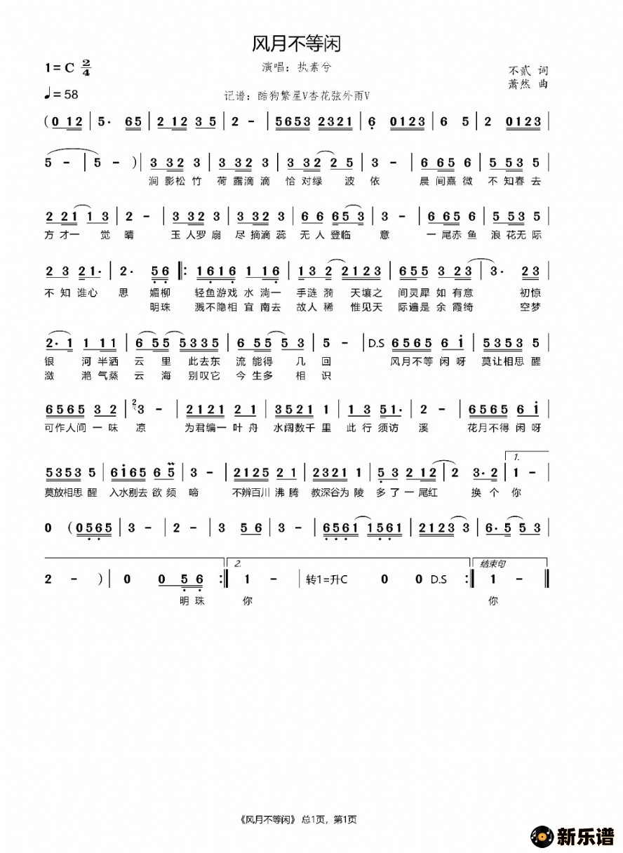 执素兮演唱的风月不等闲歌词,风月不等闲简谱.
