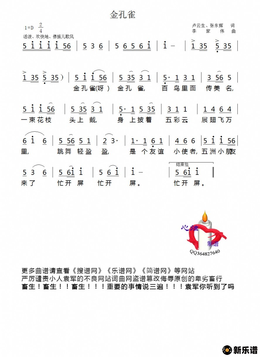 佚名演唱的金孔雀歌词,金孔雀简谱.