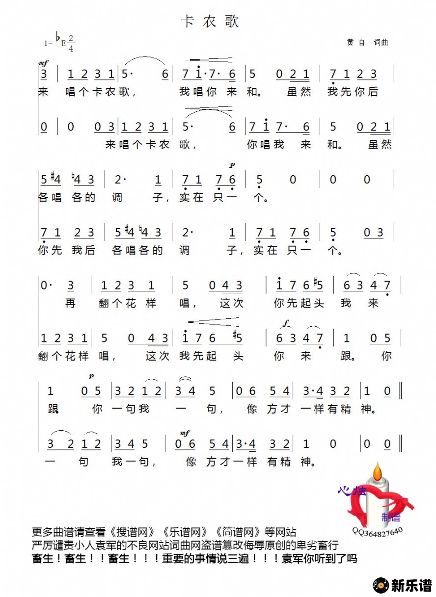 《卡农歌》简谱 佚名-心烛制谱