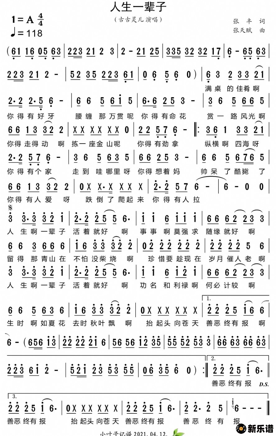 《人生一辈子》简谱 古古灵灵-小叶子制谱