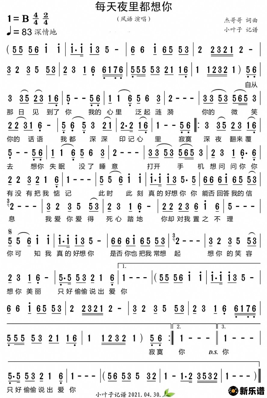 《每天夜里都想你》简谱 风语-小叶子制谱