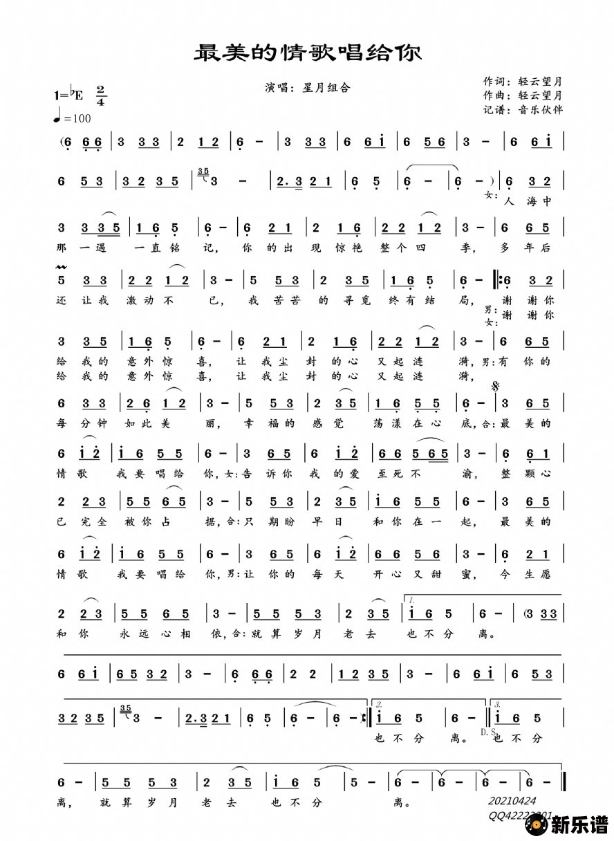 《最美的情歌唱给你》简谱 星月组合-音乐伙伴制谱