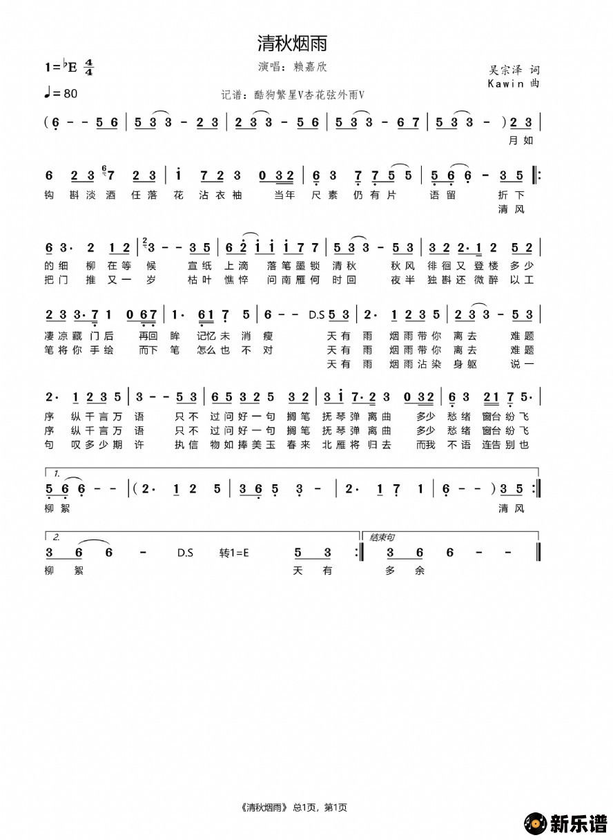 赖嘉欣演唱的清秋烟雨歌词,清秋烟雨简谱.