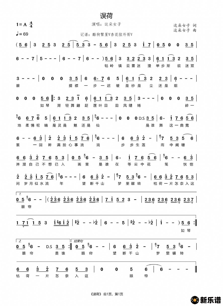 《误荷》简谱 这朵女子-杏花弦外雨制谱
