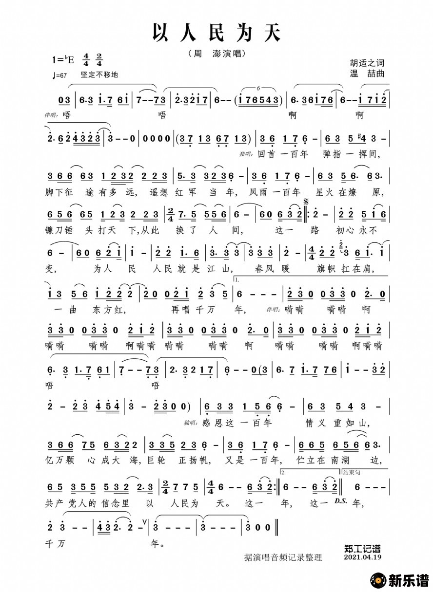 《以人民为天》简谱 周澎-郑工制谱
