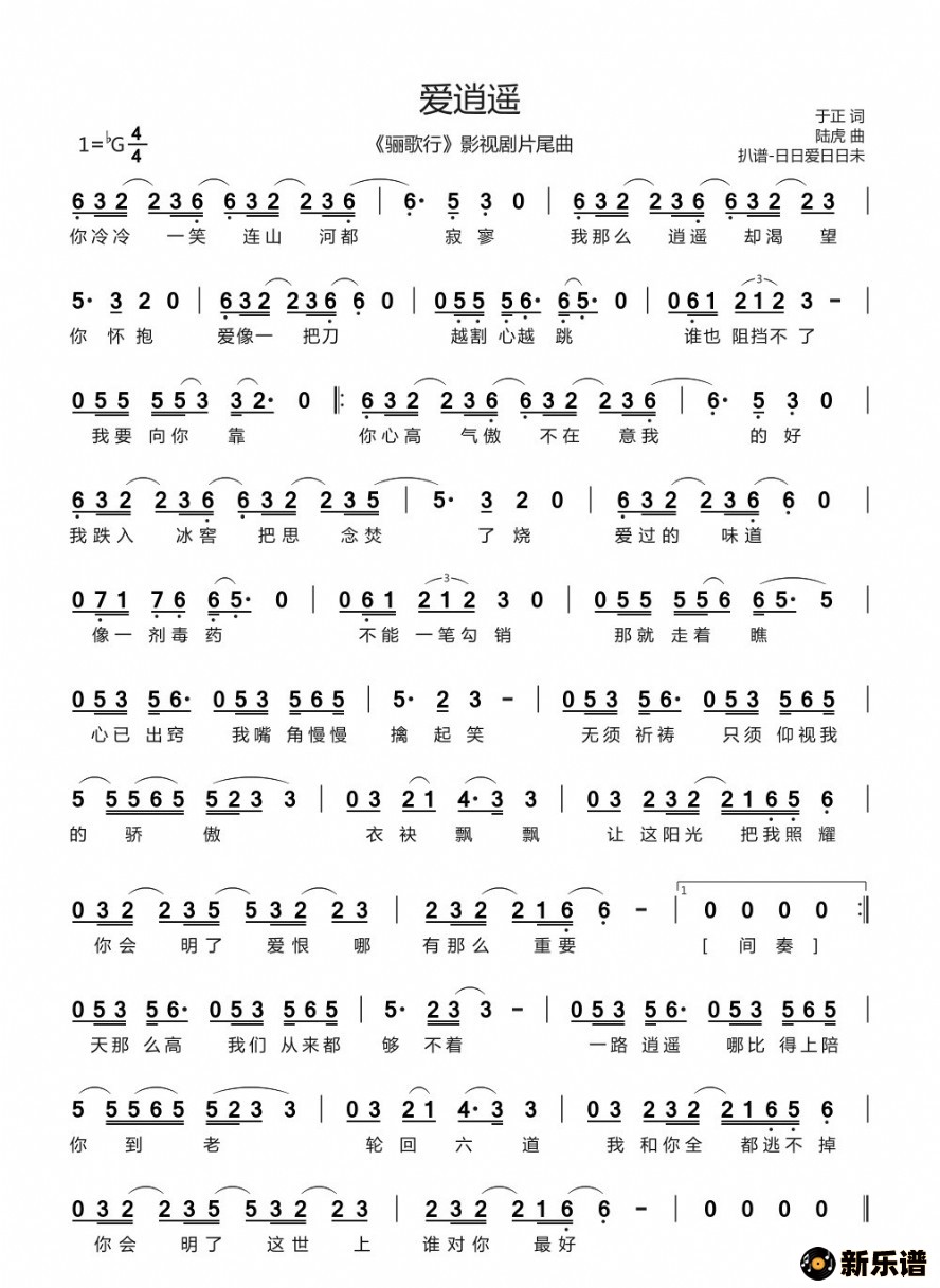 陆虎演唱的爱逍遥(《骊歌行》影视剧片尾曲)歌词,爱逍遥(《骊歌行》影视剧片尾曲)简谱.