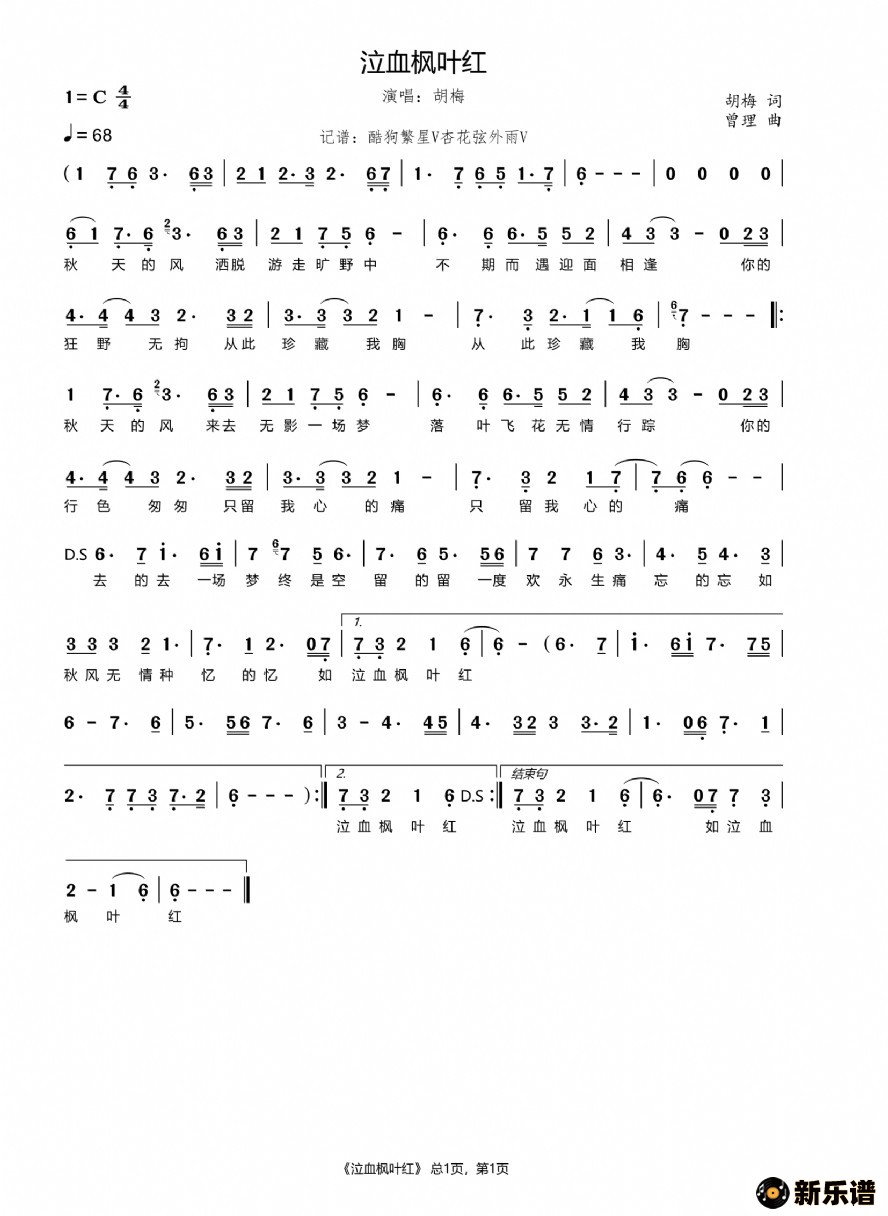 《泣血枫叶红》简谱 胡梅-杏花弦外雨制谱