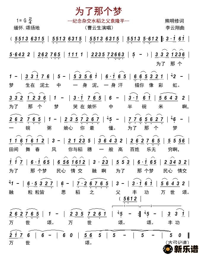 《为了那个梦(纪念杂交水稻之父袁隆平)》简谱 曹云生-古弓制谱