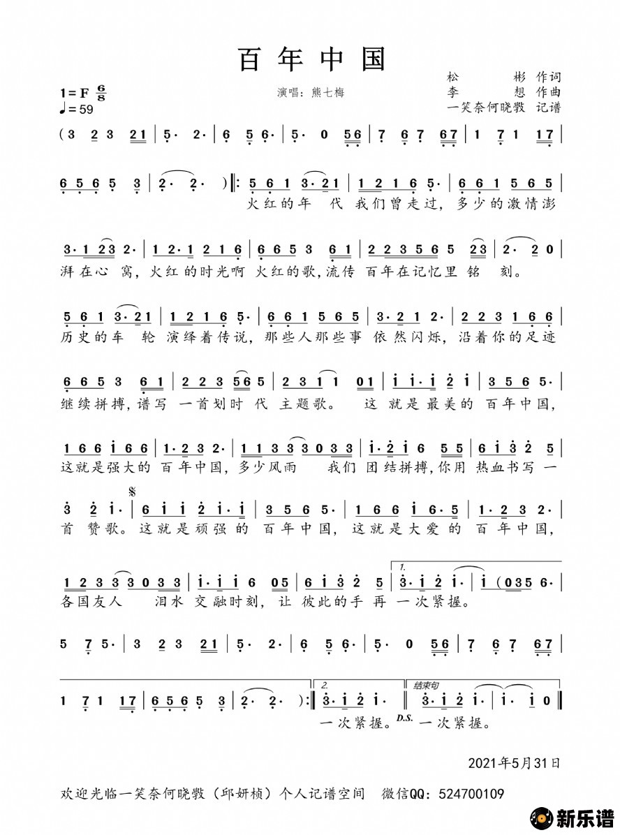《百年中国》简谱 熊七梅-一笑奈何晓斅制谱