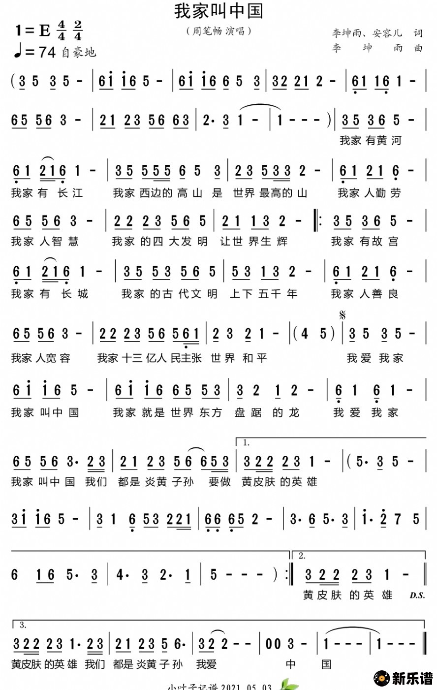 《我家叫中国》简谱 周笔畅-小叶子制谱