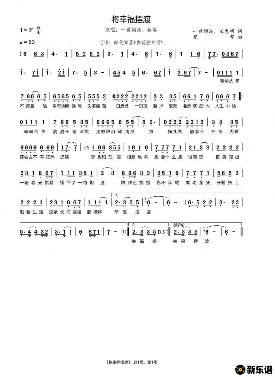 蒋婴演唱的将幸福摆渡歌词,将幸福摆渡简谱.