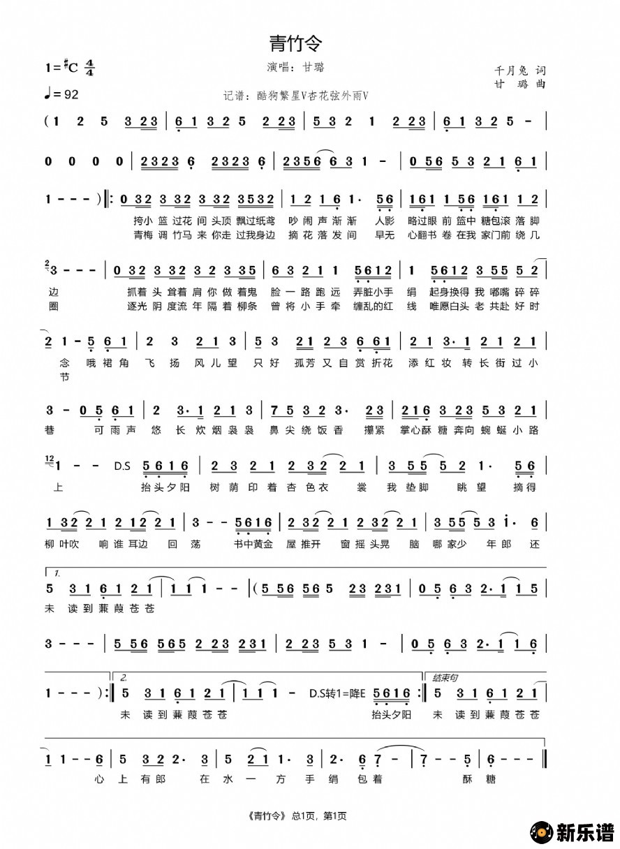 甘璐演唱的青竹令歌词,青竹令简谱.