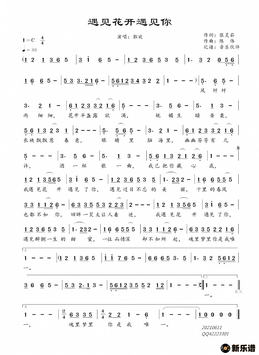 遇见花开遇见你郭欢 郭欢演唱的遇见花开遇见你歌词,遇见花开遇见你简谱. 风纤纤 雨细细花开半盏露欲滴妩媚生 暗香袭衣袂飘飘惹春意眼睛里 脑海里幽幽芬芳有几许酒一杯 歌一曲我已把你藏心底我遇见花开遇见了你遇见过目不忘的美丽十里的春风 也都不如你回眸一笑太让人着迷我遇见花开遇见了你遇见醉倒一生的甜蜜一往而情深 却不知所起魂里梦里你是我唯一眼睛里 脑海里幽幽芬芳有几许酒一杯 歌一曲我已把你藏心底我遇见花开遇见了你遇见过目不忘的美丽十里的春风 也都不如你回眸一笑太让人着迷我遇见花开遇见了你遇见醉倒一生的甜蜜一往而情深 却不知所起魂里梦里你是我唯一我遇见花开遇见了你遇见过目不忘的美丽十里的春风 也都不如你回眸一笑太让人着迷我遇见花开遇见了你遇见醉倒一生的甜蜜一往而情深 却不知所起魂里梦里你是我唯一魂里梦里你是我唯一 此简谱由新乐谱会员 音乐伙伴 上传