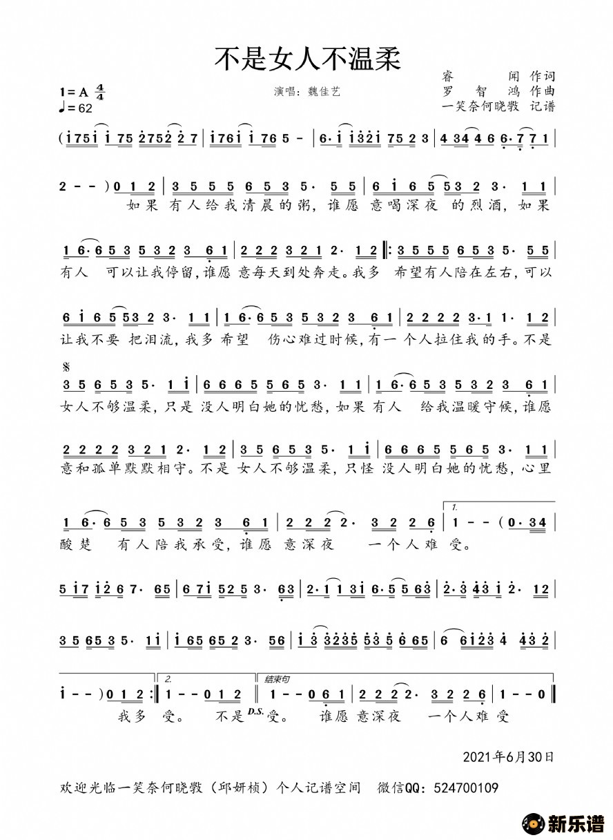 不是女人不温柔魏佳艺 魏佳艺演唱的不是女人不温柔歌词,不是女人不温柔简谱. 如果有人给我清晨的粥谁愿意喝深夜的烈酒如果有人可以让我停留谁愿意每天到处奔走我多希望有人陪在左右可以让我不要把泪流我多希望伤心难过时候有一个人拉住我的手不是女人不够温柔只是没人明白她的忧愁如果有人 给我温暖守候谁愿意和孤单默默相守不是女人不够温柔只怪没人明白她的忧愁心里酸楚 有人陪我承受谁愿意深夜一个人难受我多希望有人陪在左右可以让我不要把泪流我多希望伤心难过时候有一个人拉住我的手不是女人不够温柔只是没人明白她的忧愁如果有人 给我温暖守候谁愿意和孤单默默相守不是女人不够温柔只怪没人明白她的忧愁心里酸楚 有人陪我承受谁愿意深夜一个人难受不是女人不够温柔只是没人明白她的忧愁如果有人 给我温暖守候谁愿意和孤单默默相守不是女人不够温柔只怪没人明白她的忧愁心里酸楚 有人陪我承受谁愿意深夜一个人难受谁愿意深夜一个人难受 此简谱由新乐谱会员 一笑奈何晓斅 上传