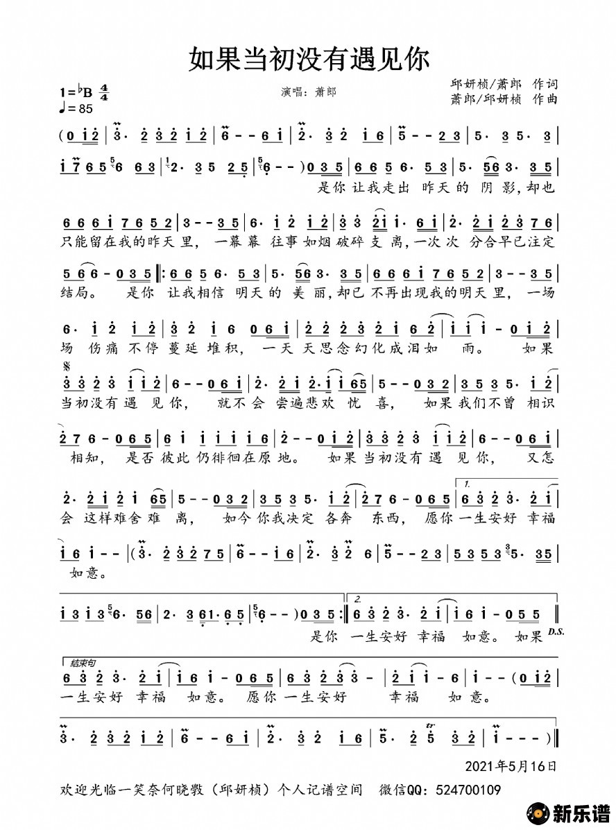 《如果当初没有遇见你你(男版)》简谱 萧郎-一笑奈何晓斅制谱