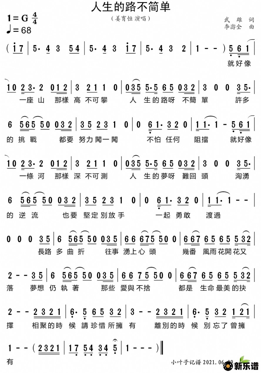 《人生的路不简单》简谱 姜育恒-小叶子制谱