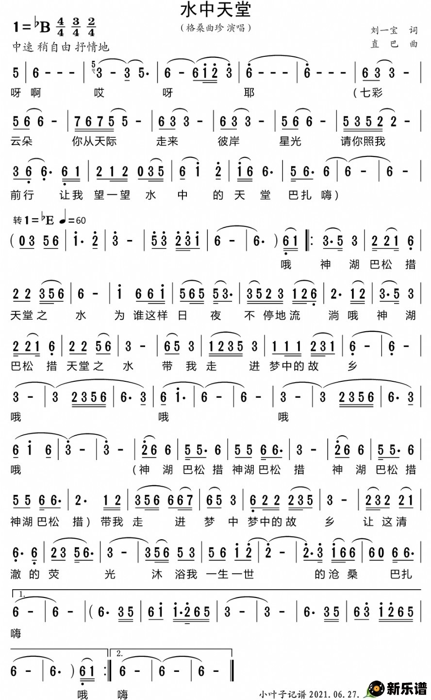 《水中天堂》简谱 格桑曲珍-小叶子制谱