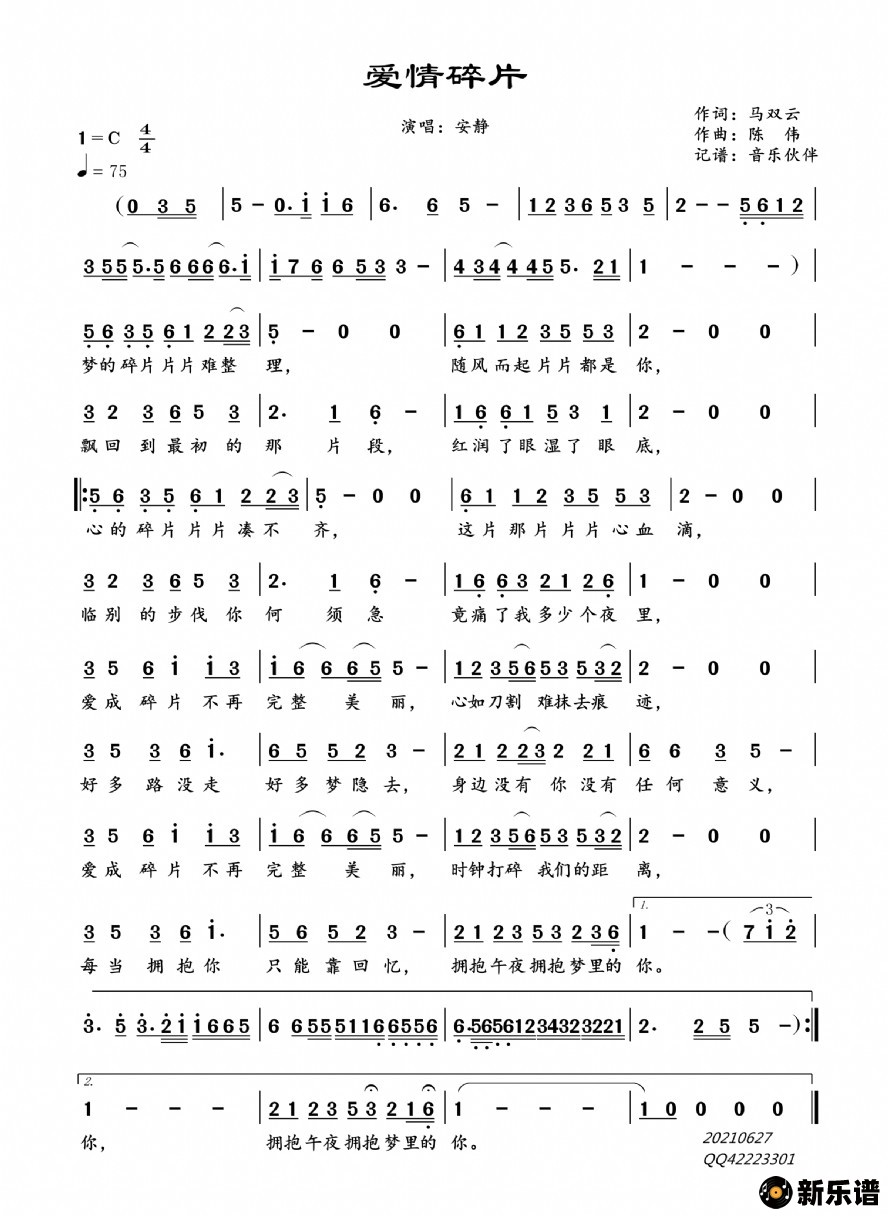 安静演唱的爱情碎片歌词,爱情碎片简谱.