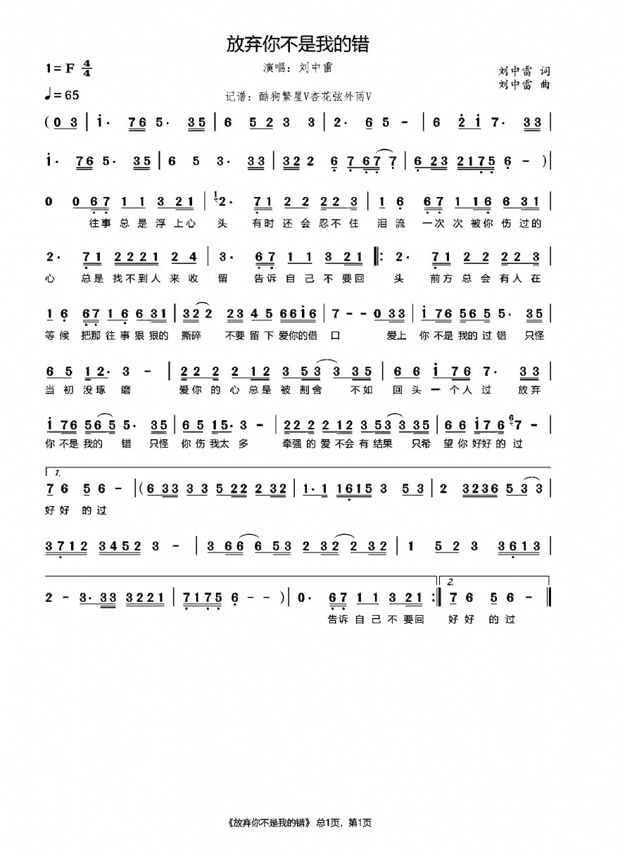 《放弃你不是我的错》简谱 刘中雷-杏花弦外雨制谱