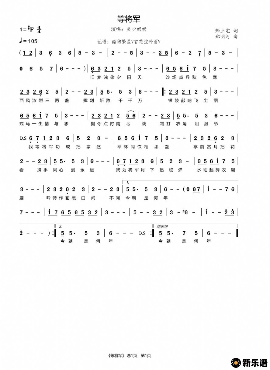 美少奶奶演唱的等将军歌词,等将军简谱.