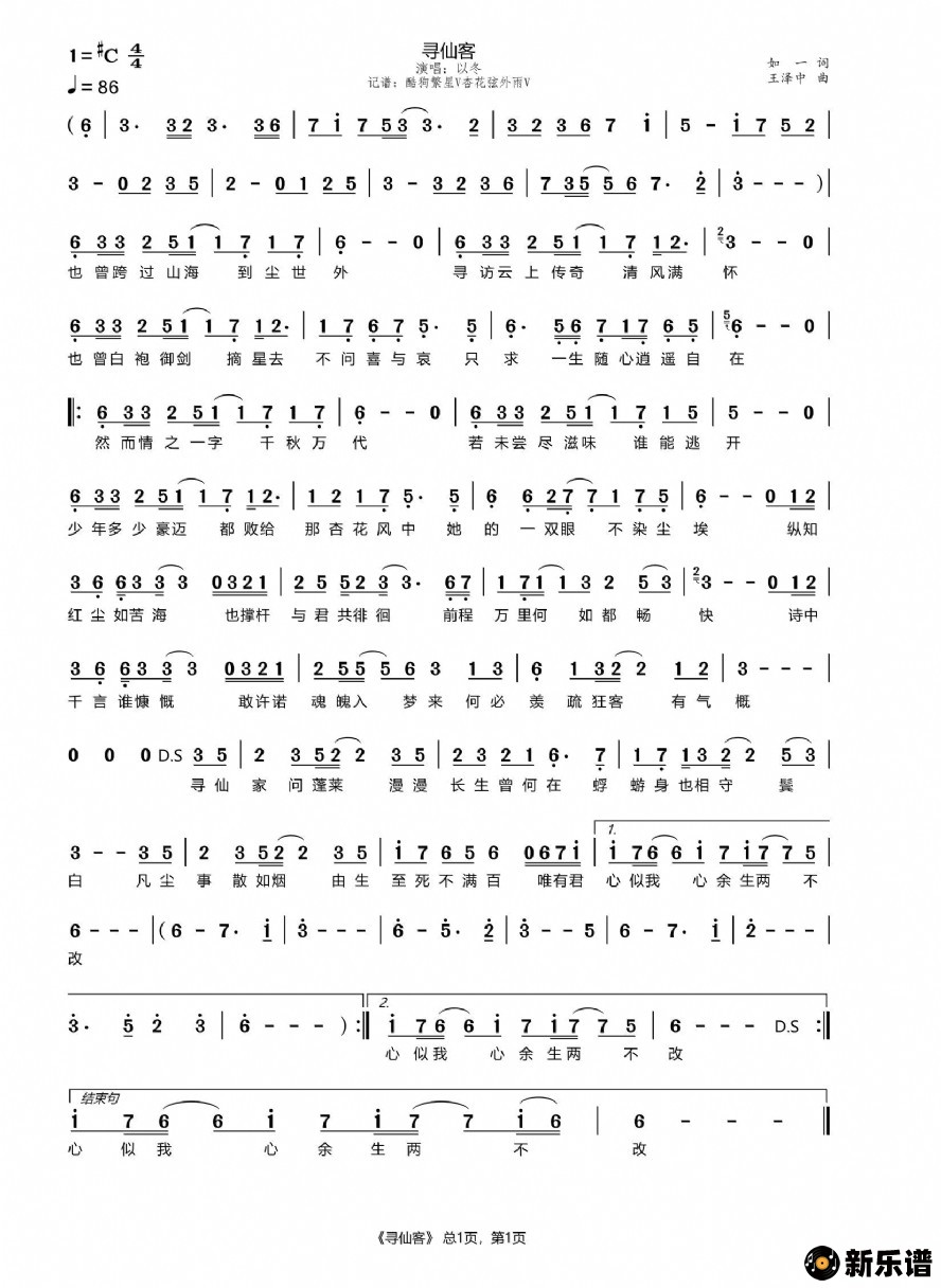 以冬演唱的寻仙客歌词,寻仙客简谱.