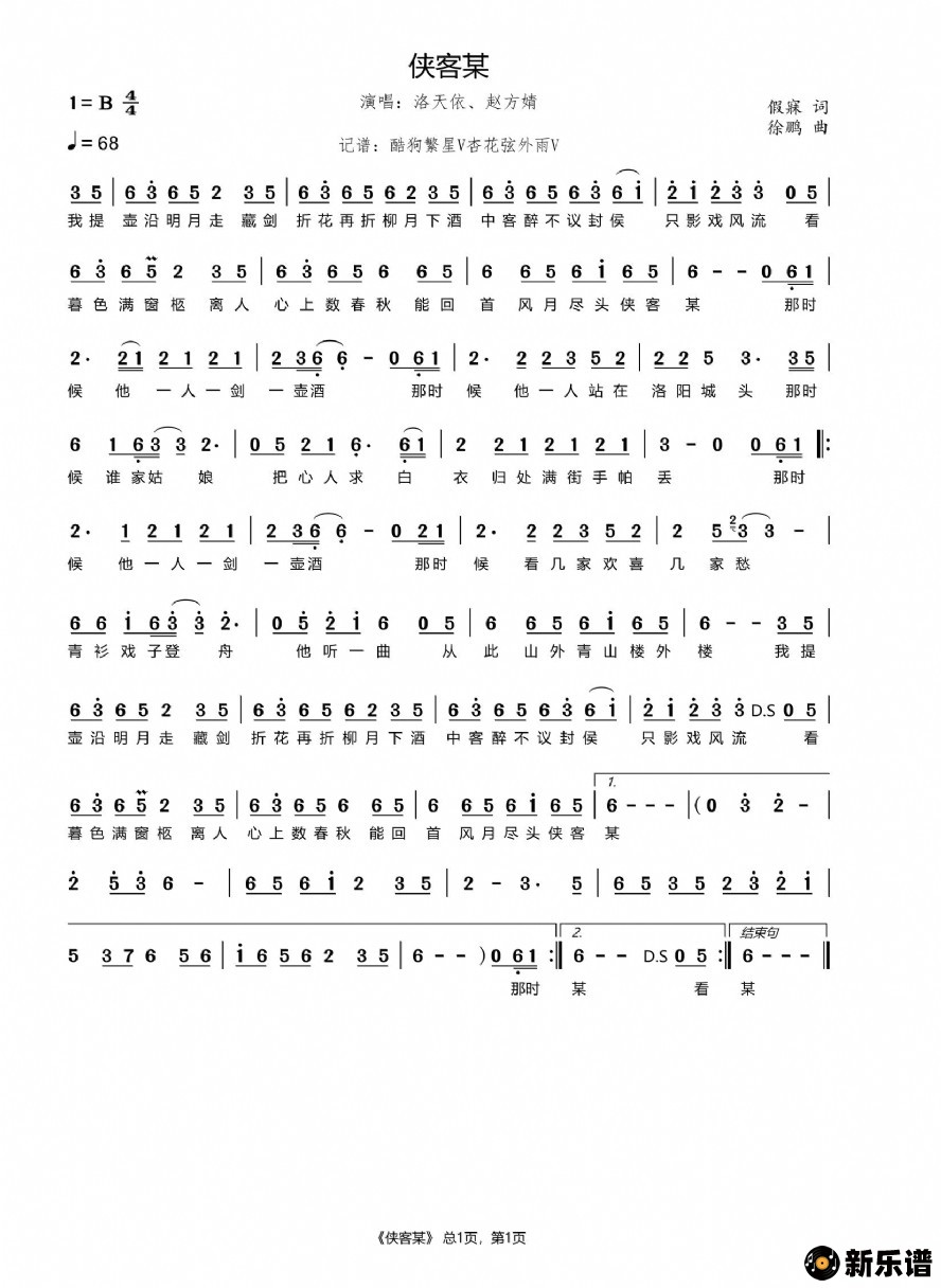 洛天依演唱的侠客某歌词,侠客某简谱.