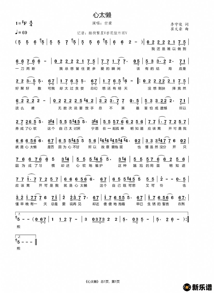 《心太懒》简谱 付豪-杏花弦外雨制谱
