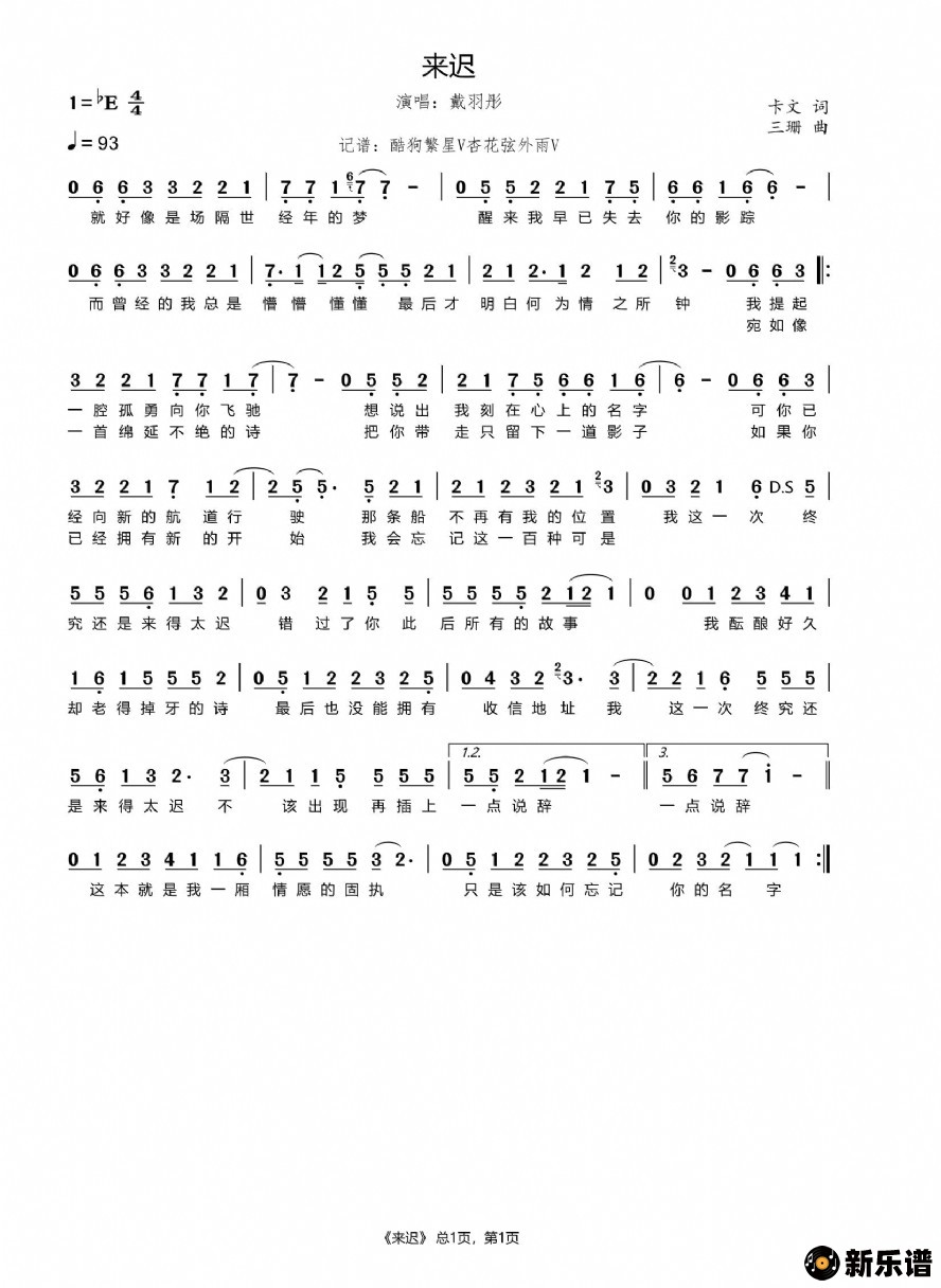 戴羽彤演唱的来迟歌词,来迟简谱.