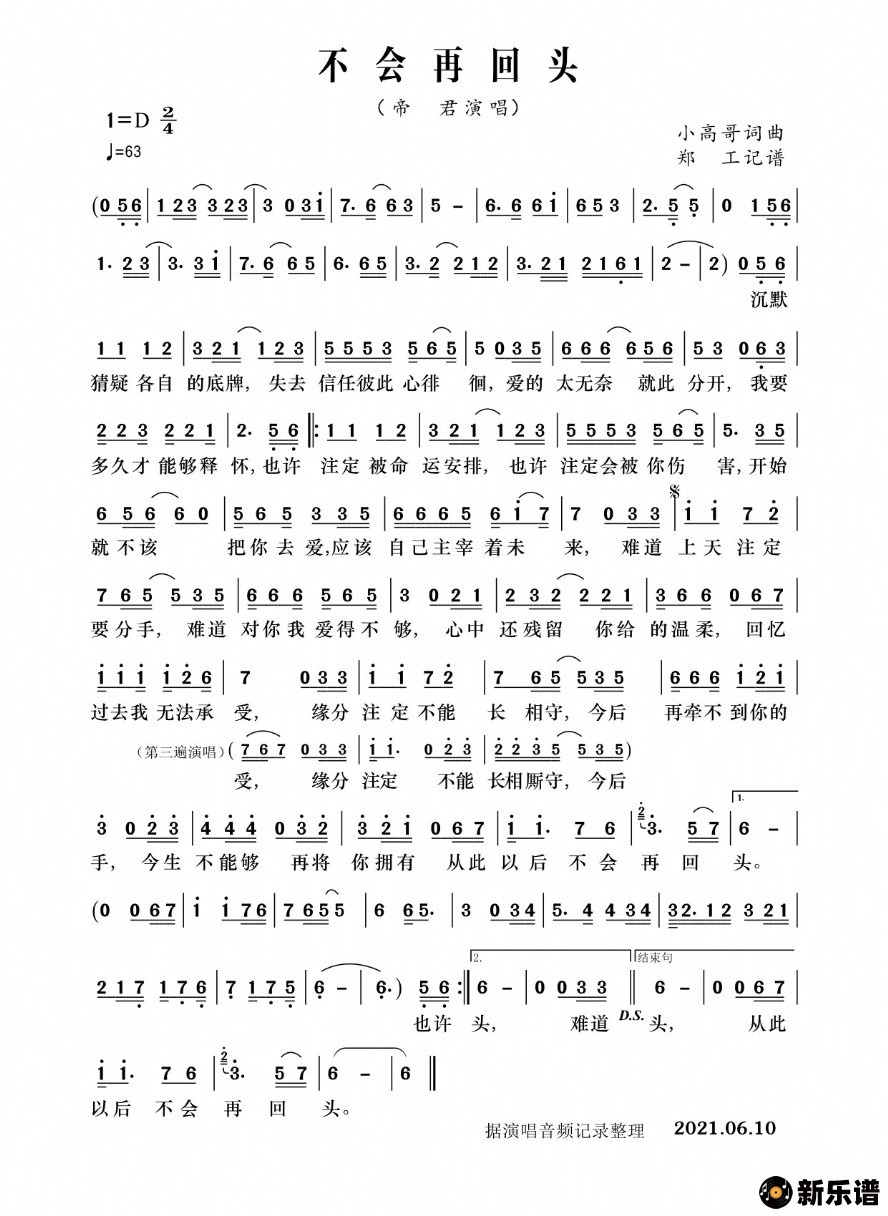 帝君演唱的不会再回头歌词,不会再回头简谱.