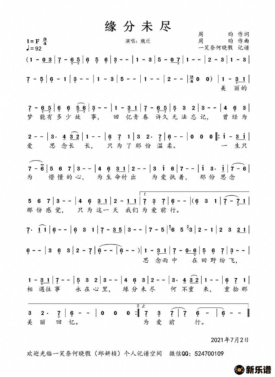 魏近演唱的缘分未尽(电影 80后吹事班 主题曲)歌词,缘分未尽(电影 80后吹事班 主题曲)简谱.