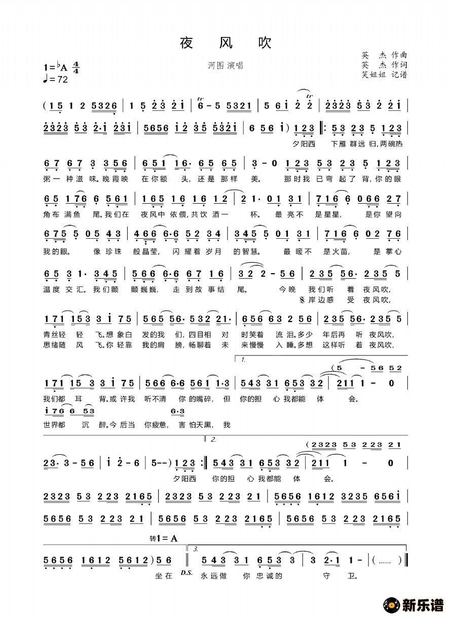 河图演唱的夜风吹歌词,夜风吹简谱.