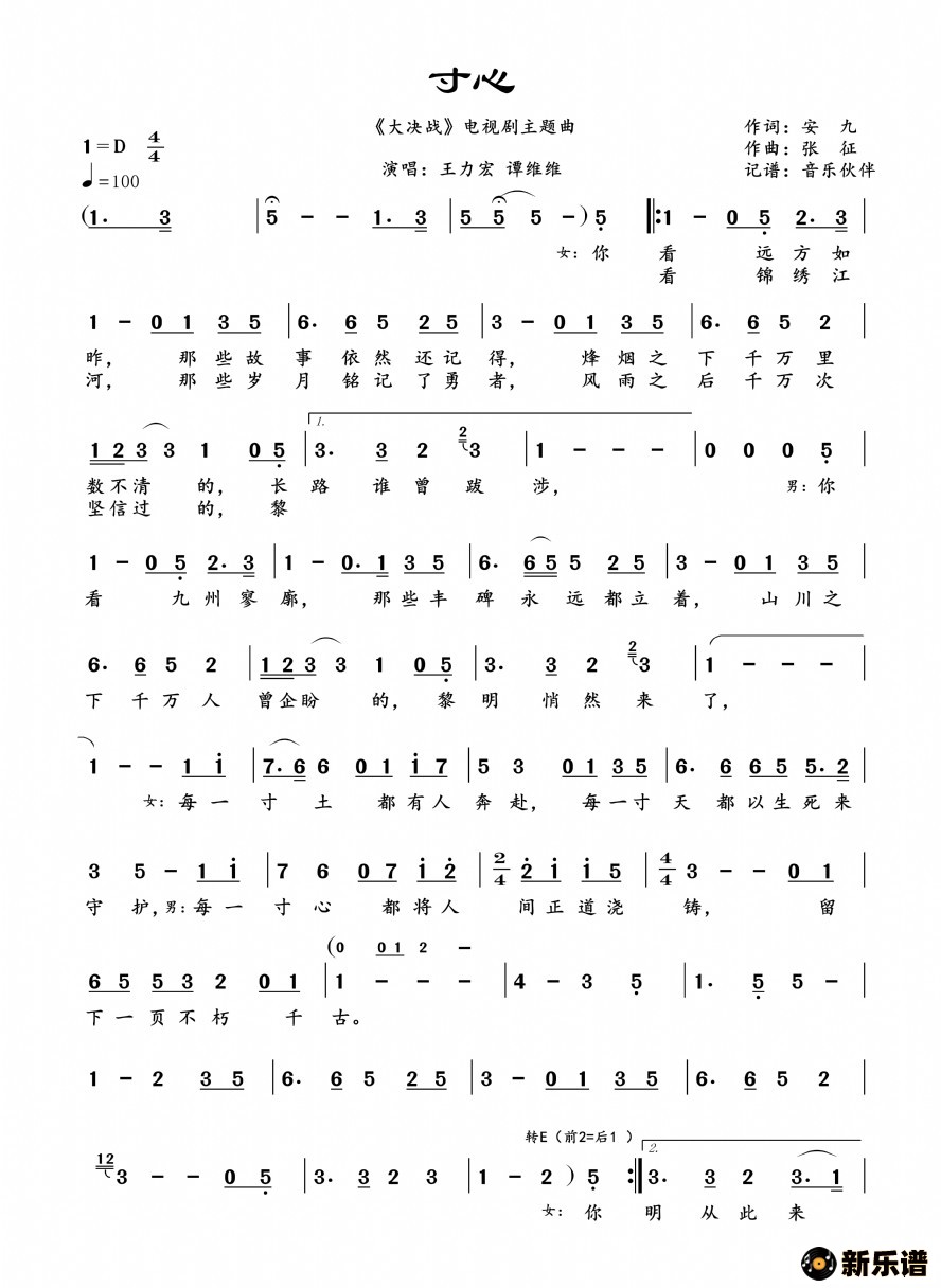 王力宏/谭维维演唱的寸心(《大决战》电视剧主题曲)歌词,寸心(《大决战》电视剧主题曲)简谱.