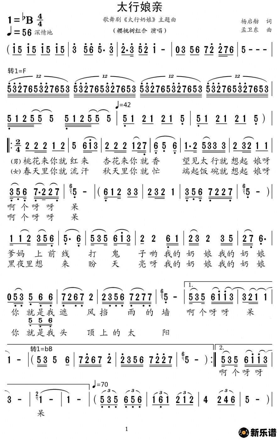 樱桃树组合演唱的太行娘亲(歌舞剧《太行奶娘》主题曲)歌词,太行娘亲(歌舞剧《太行奶娘》主题曲)简谱.
