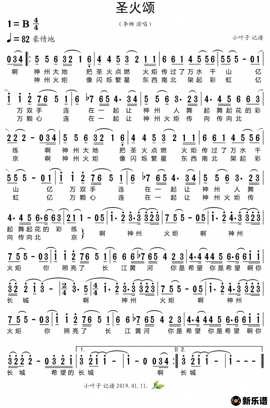 《圣火颂》简谱 李娜-小叶子制谱