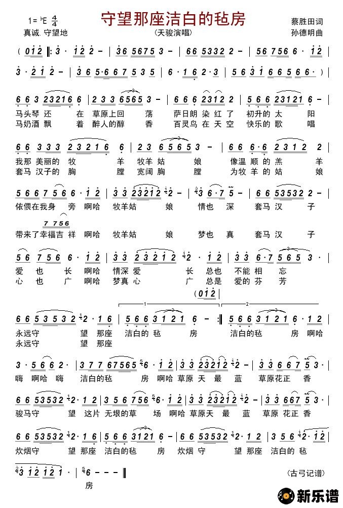 《守望那座洁白的毡房》简谱 天骏-古弓制谱