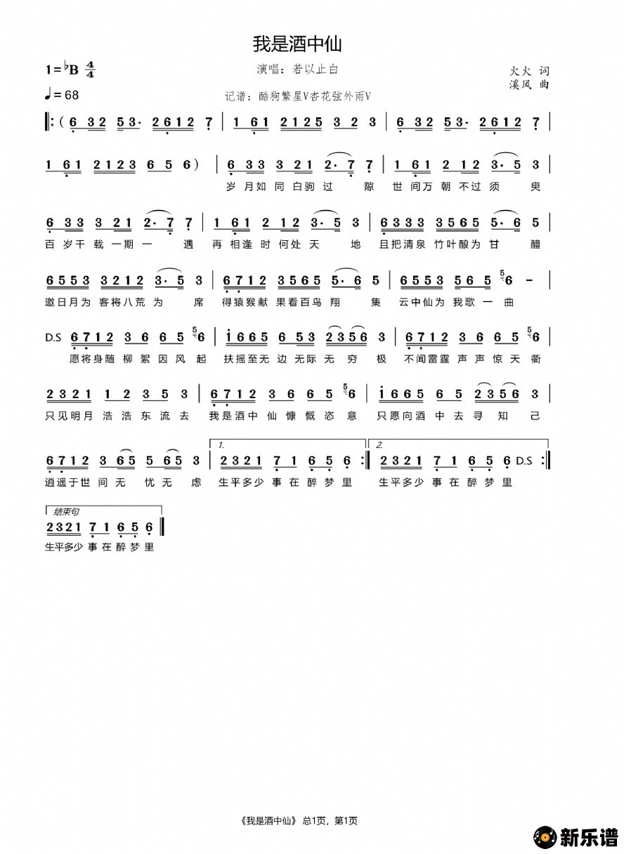 若以止白演唱的我是酒中仙歌词,我是酒中仙简谱.