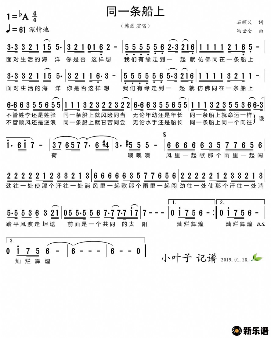 韩磊演唱的同一条船上歌词,同一条船上简谱.