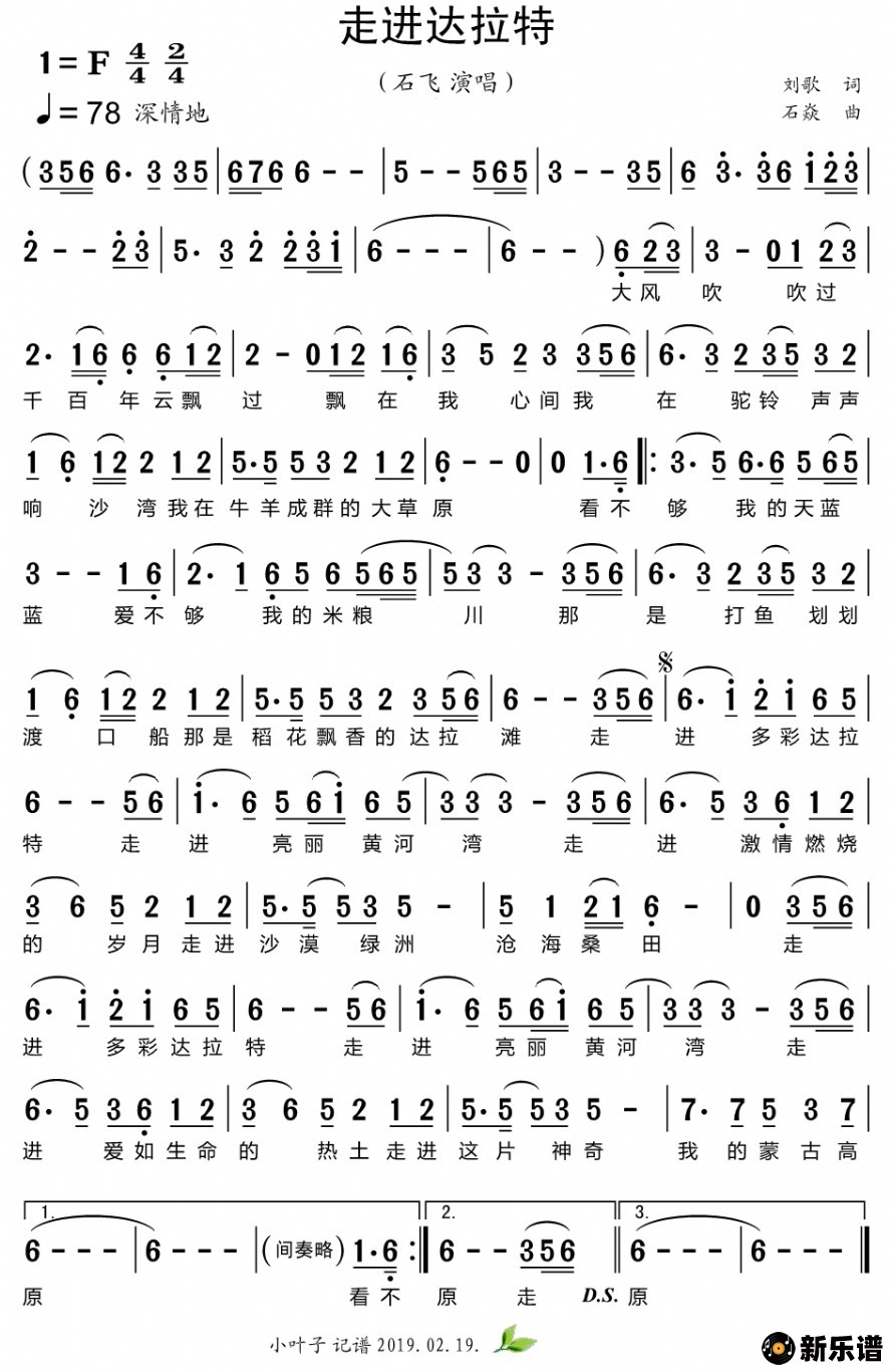 《走进达拉特》简谱 石飞-小叶子制谱