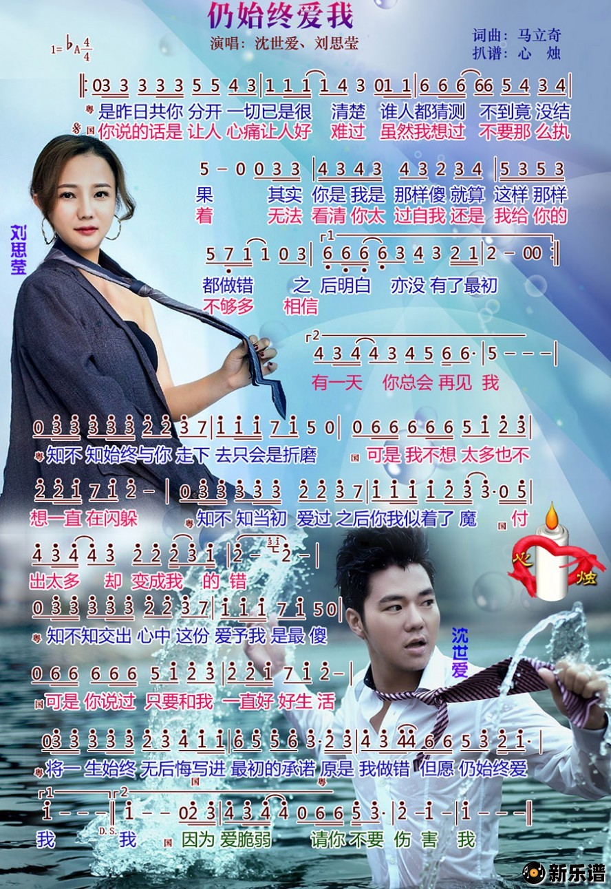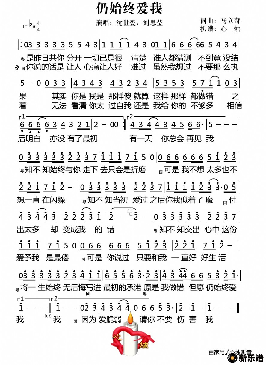 仍始终爱我沈世爱/刘思莹 沈世爱/刘思莹演唱的仍始终爱我歌词,仍始终爱我简谱. 沈: 是昨日共你分开一切已是很清楚谁人都猜测不到竟没结果其实你是我是那样傻就算这样那样都做错之后明白亦没有了最初刘: 你说的话是让人心痛让人好难过虽然我想过不要那么执着无法看清你太过自我还是我给你的不够多相信有一天你总会再见我沈: 知不知始终与你走下去只会是折磨刘: 可是我不想太多也不想一直在闪躲沈: 知不知当初爱过之后你我似着了魔刘: 付出太多却变成我的错沈: 知不知交出心中这份爱予我是最傻刘: 可是你说过只要和我一直好好生活沈: 将一生始终无后悔刘: 写进最初的承诺沈: 原是我做错但愿仍始终爱我刘: 你说的话是让人心痛让人好难过虽然我想过不要那么执着无法看清你太过自我还是我给你的不够多相信有一天你总会再见我沈: 知不知始终与你走下去只会是折磨刘: 可是我不想太多也不想一直在闪躲沈: 知不知当初爱过之后你我似着了魔刘: 付出太多却变成我的错沈: 知不知交出心中这份爱予我是最傻刘: 可是你说过只要和我一直好好生活沈: 将一生始终无后悔刘: 写进最初的承诺沈: 原是我做错但愿仍始终爱我合: 因为爱脆弱请你不要伤害我 此简谱由新乐谱会员 心烛 上传