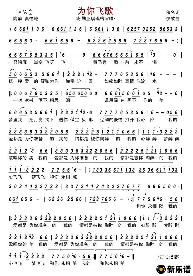 《为你飞歌》简谱 苏勒亚琪琪格-古弓制谱
