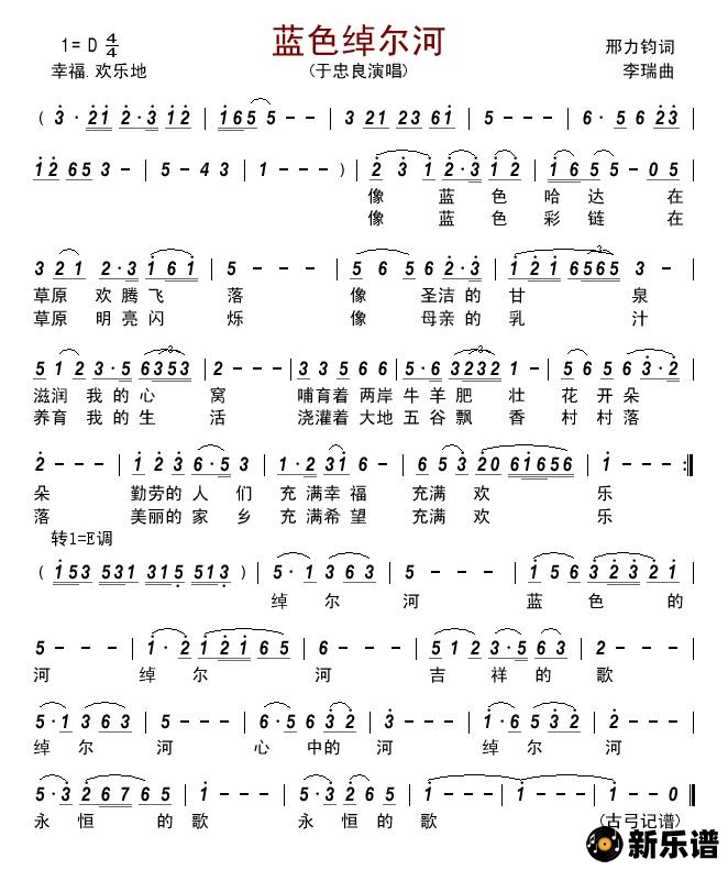 于忠良演唱的蓝色绰尔河歌词,蓝色绰尔河简谱.