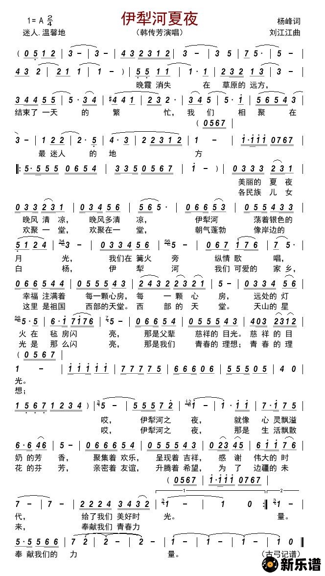 韩传芳演唱的伊犁河夏夜歌词,伊犁河夏夜简谱.