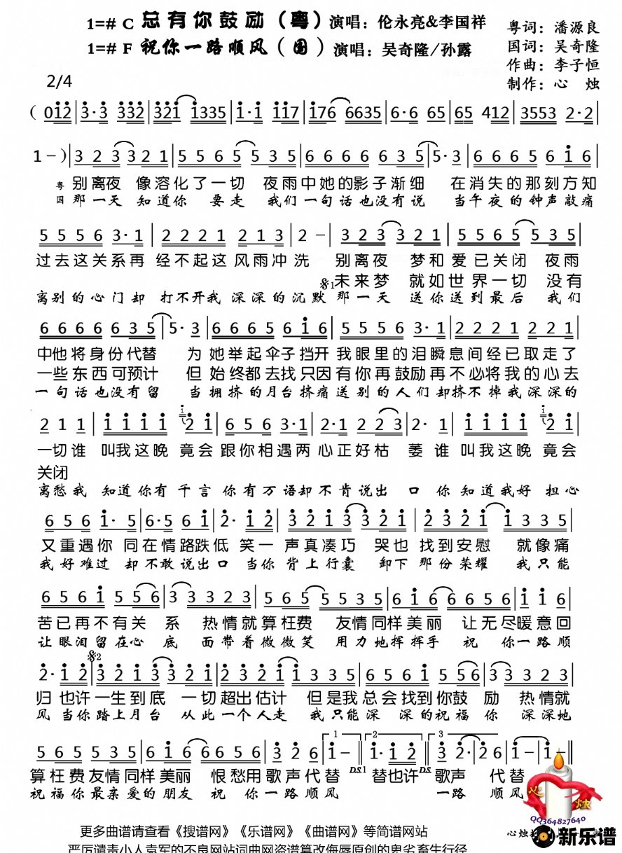 《总有你鼓励(粤)(祝你一路顺风)》简谱 伦永亮/李国祥/孙露-心烛制谱