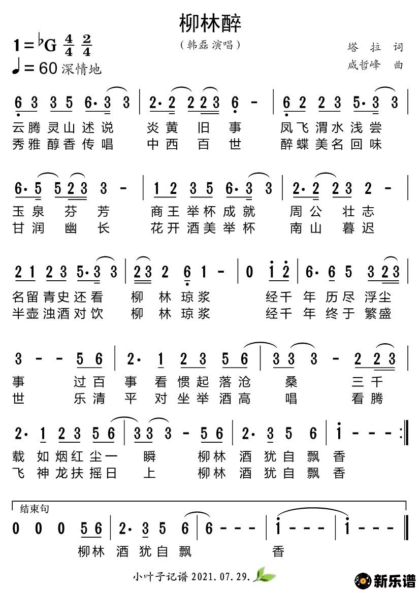 韩磊演唱的柳林醉歌词,柳林醉简谱.