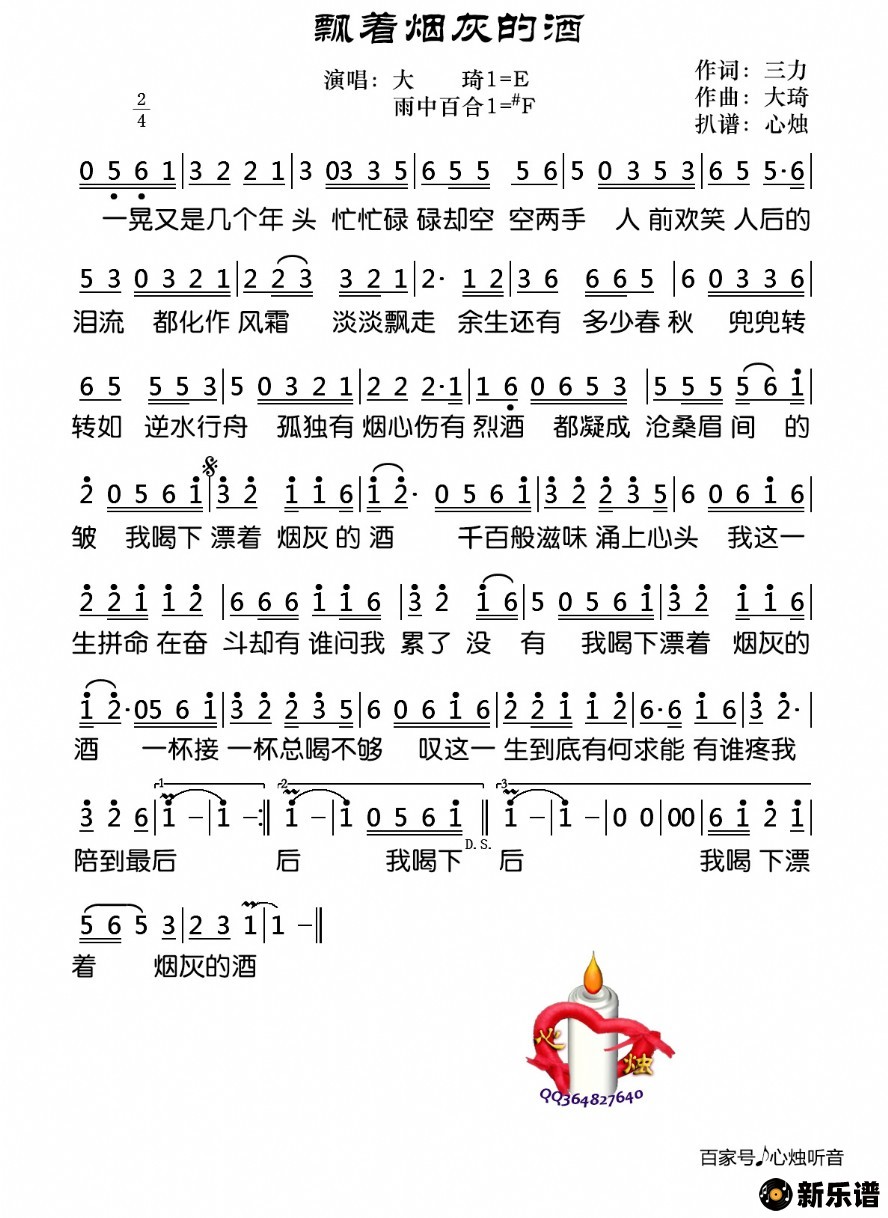 《飘着烟灰的酒》简谱 大琦-心烛制谱